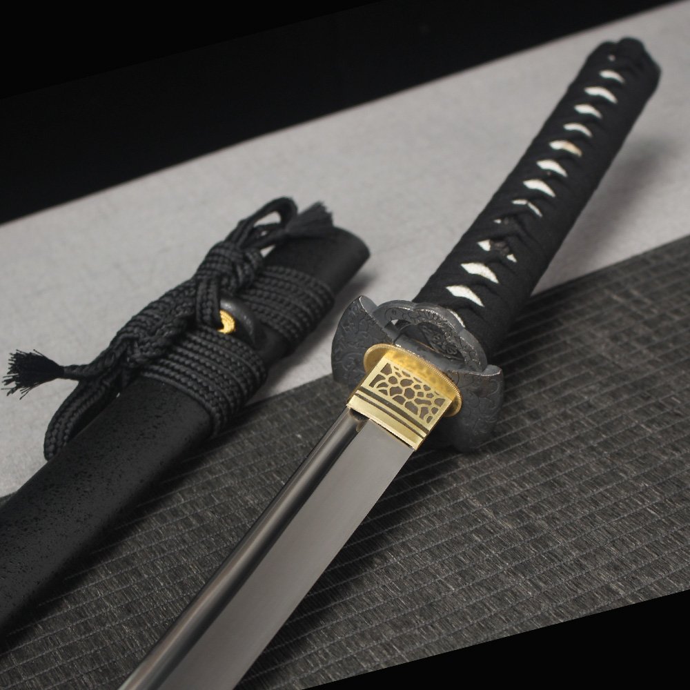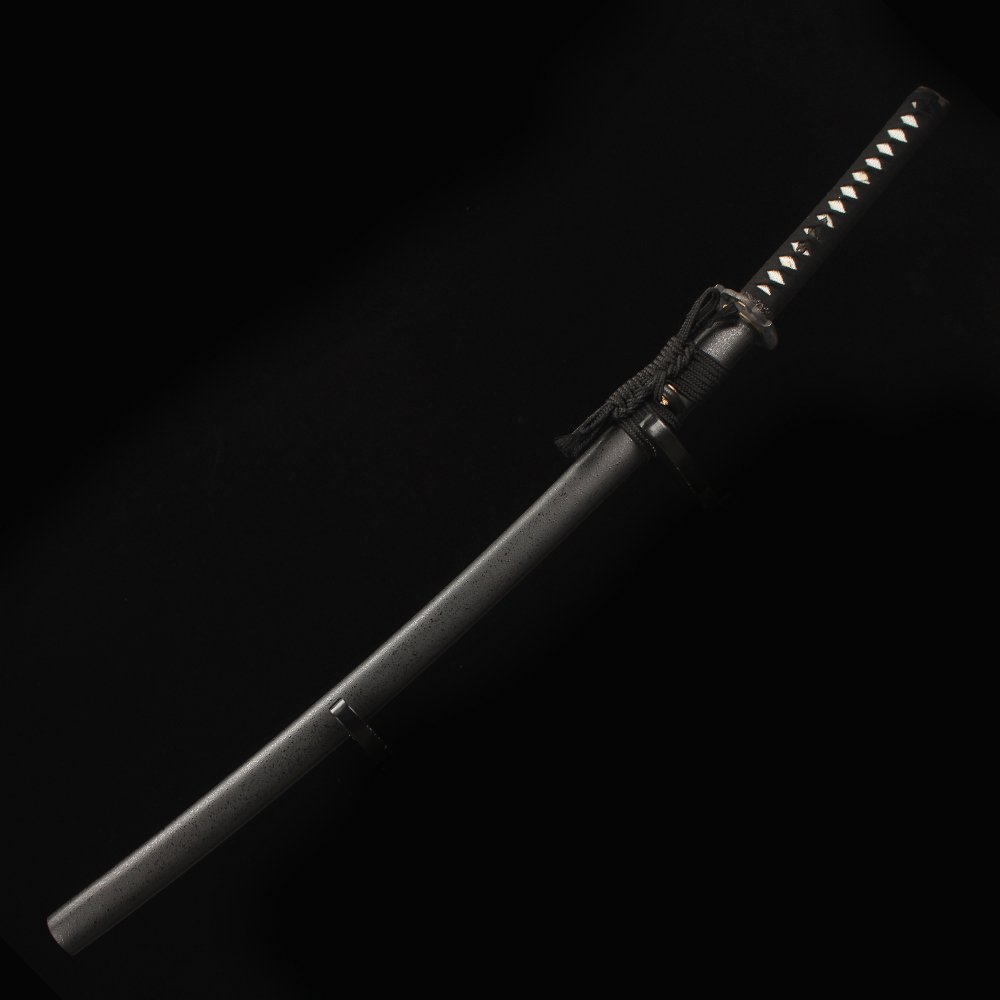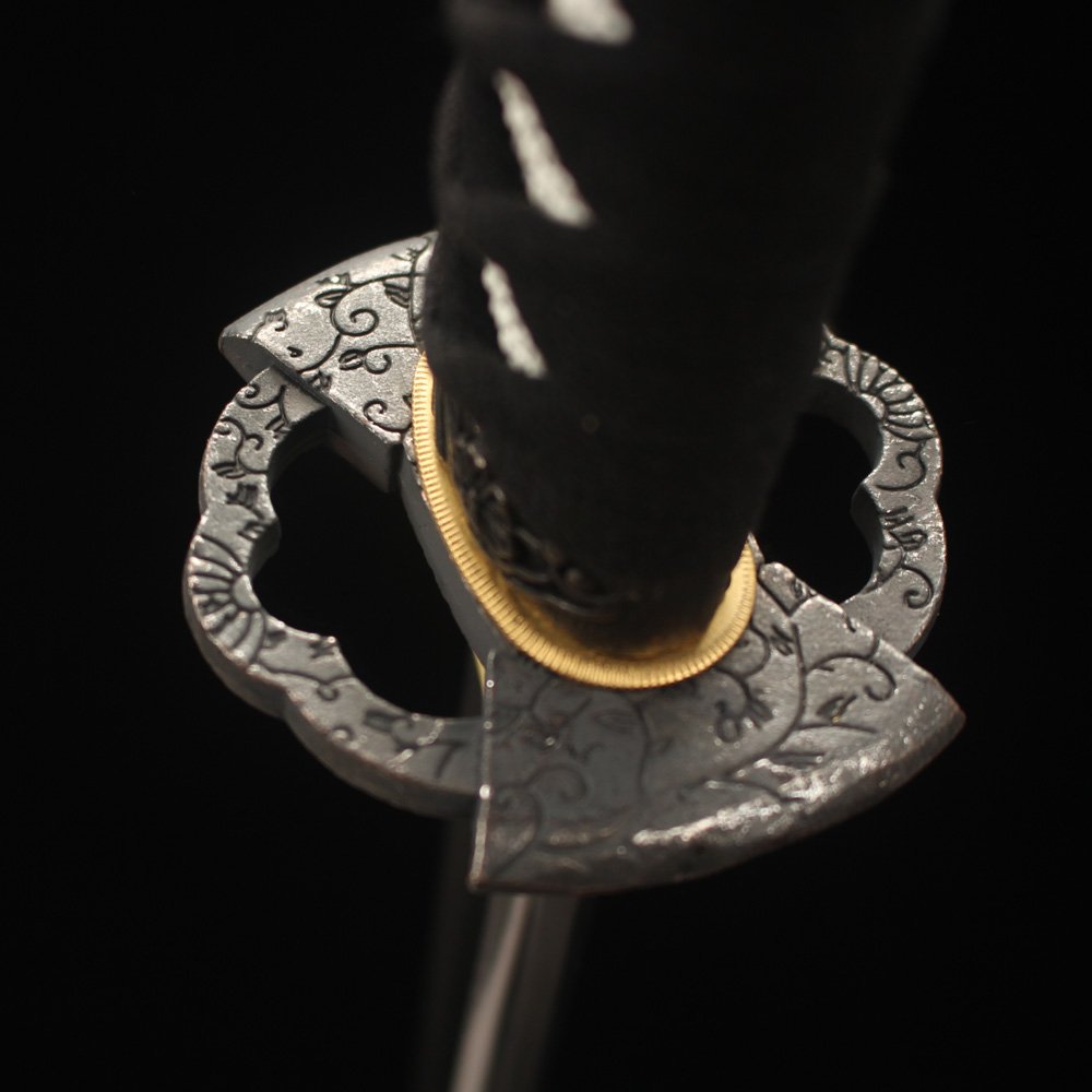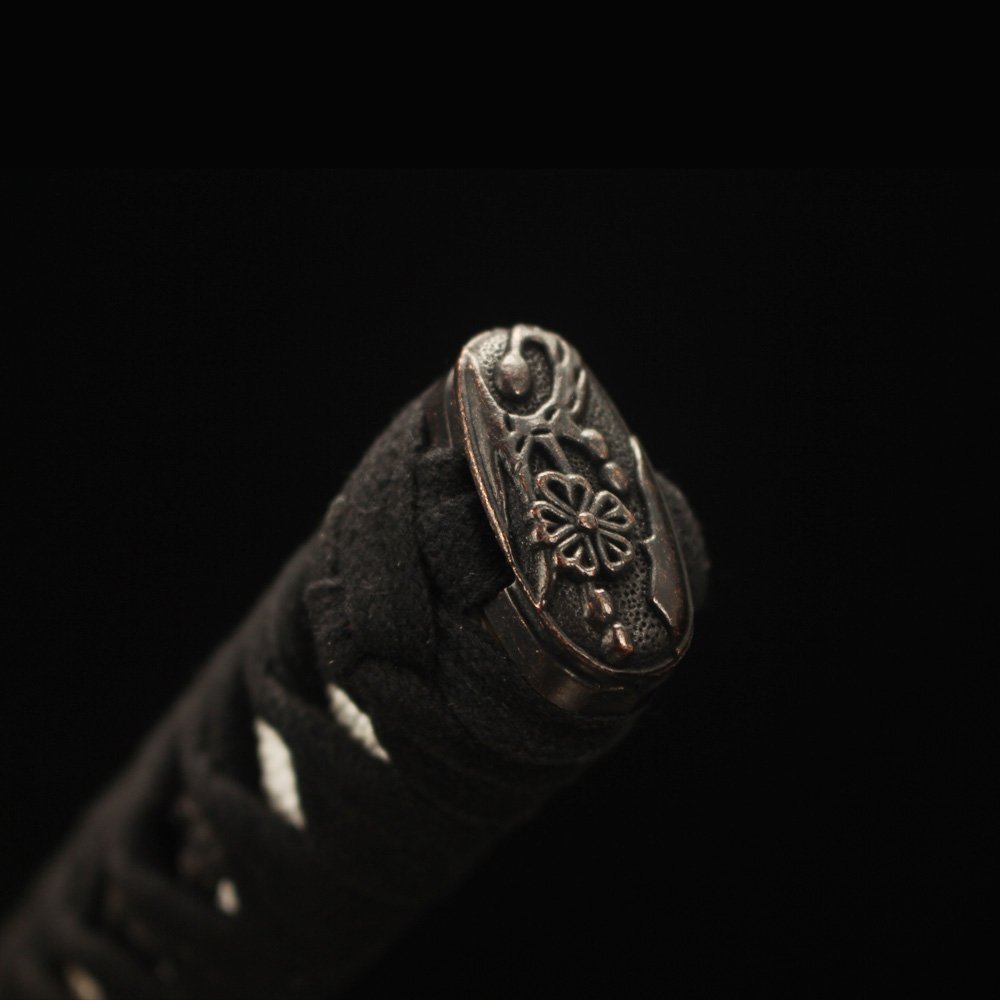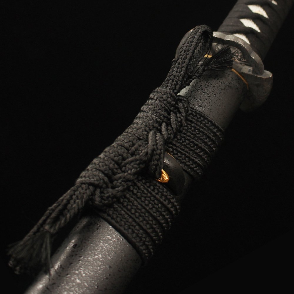 The blade has a long Hi (blood groove) on each side, this not only allows for a lighter blade and audible feedback when swung, but also can balance the blade to achieve optimal performance. The tip of the blade is a Chu Kissaki (medium length).This blade has been hand polished with multiple grade sharpen stone by Japanese method, which made the surface of the blade like a mirror, the blade is also very sharp.This blade comes with a full length Tang which greatly enhances the strength of the sword. this sword is strong enough to cut through a thick bamboo tree with a single strike yet sharp enough to slice paper.