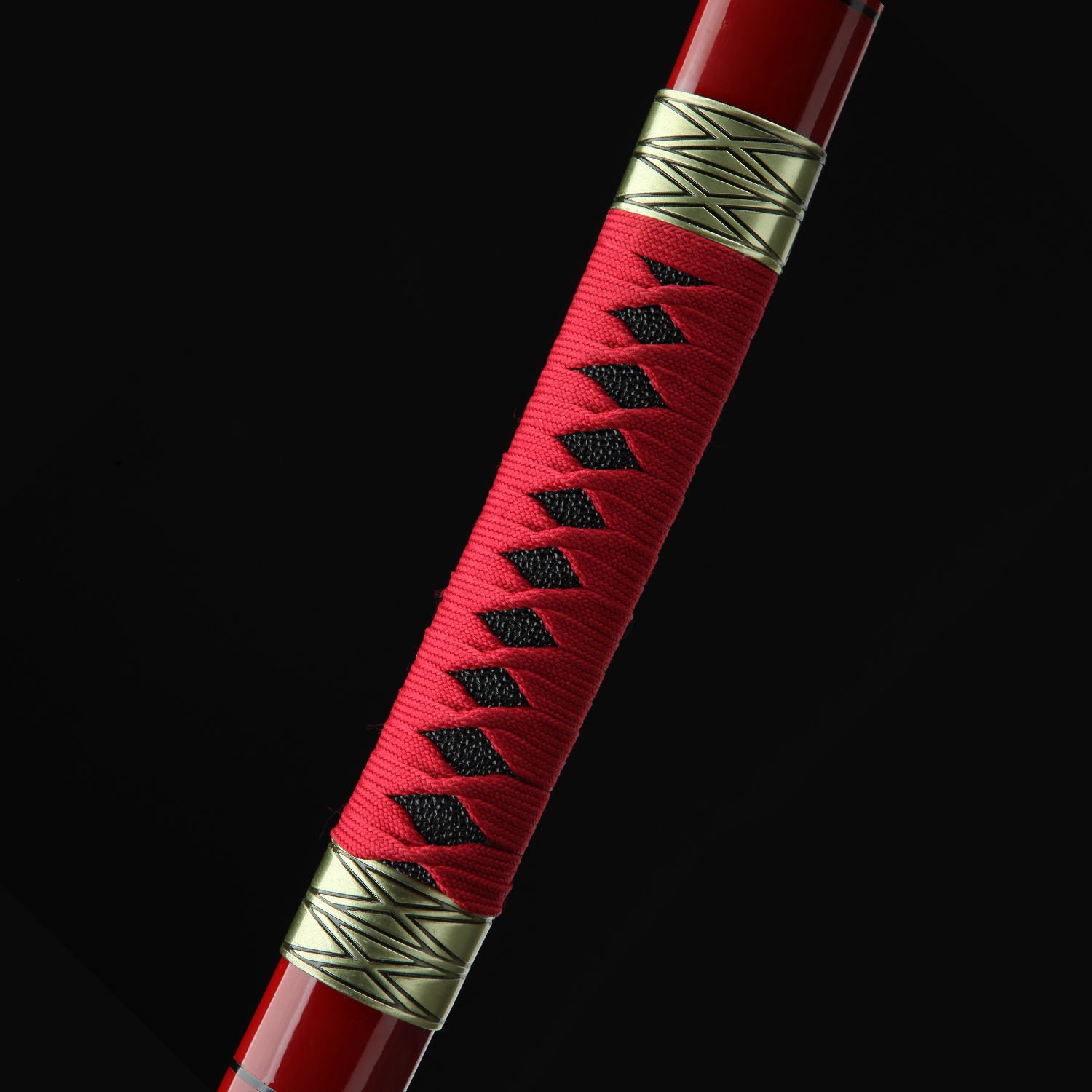 The hardwood saya, or scabbard, is coated with a premium natural lacquer and features a vibrant red color, staying true to the manga theme. The lacquer not only adds a layer of protection to the saya but also provides a striking contrast with the black and red handle.