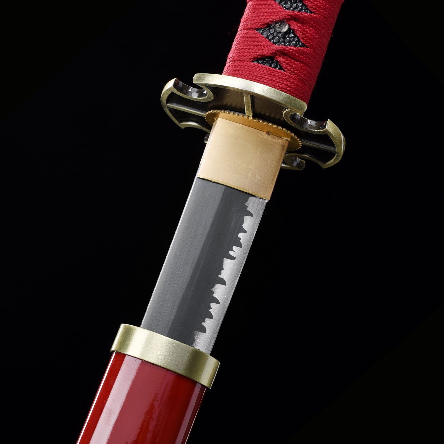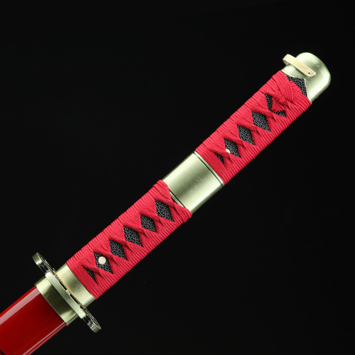 One Piece Sword, an iconic weapon that will delight fans of the famous One Piece manga and anime series. This full-tang sword is crafted with precision and dedication to the smallest details, making it an exceptional piece for collectors, enthusiasts, and cosplayers alike. With its 1045 carbon steel blade, elegant handle, and striking red saya, this Katana is a true testament to the legacy of Zoro, the Pirate Hunter.