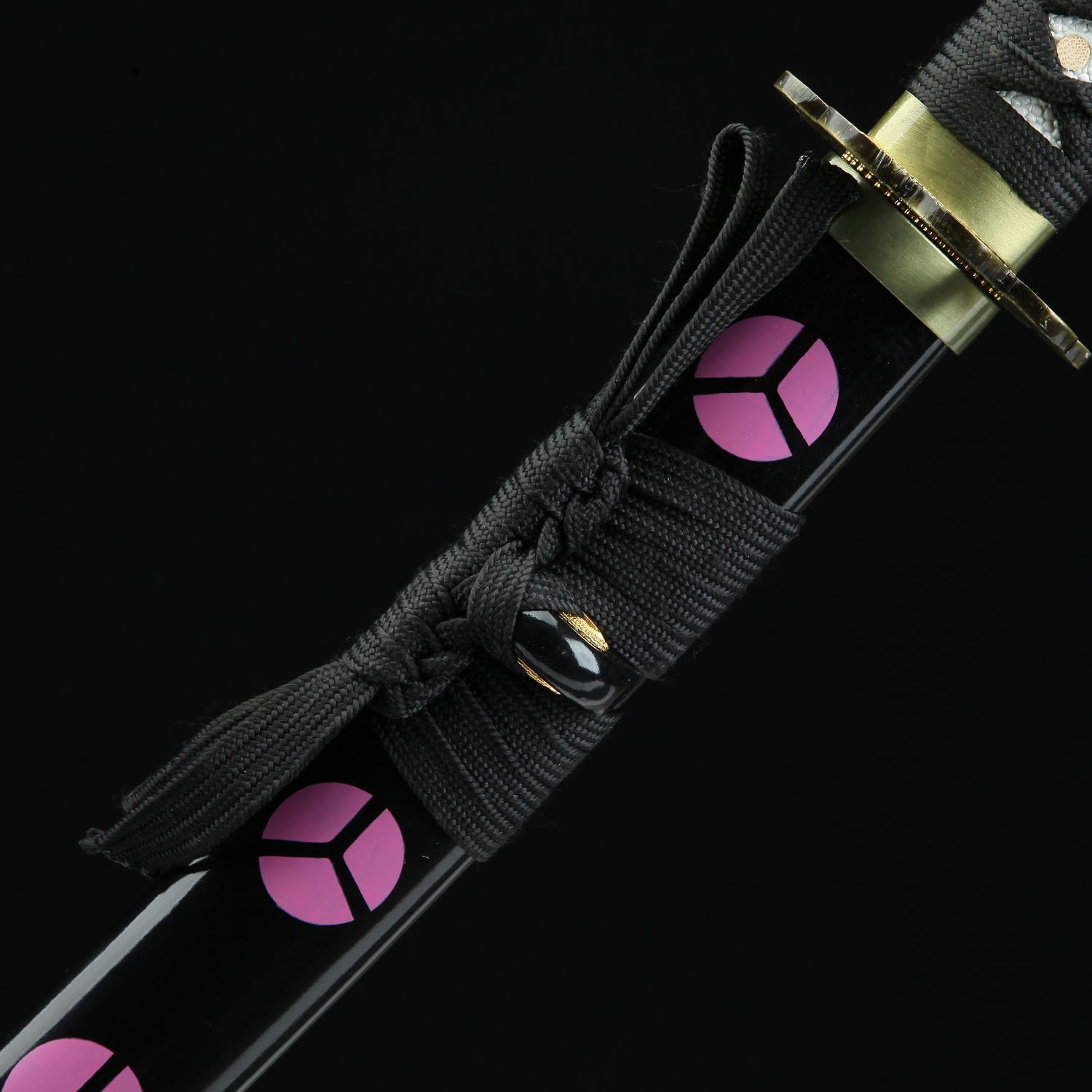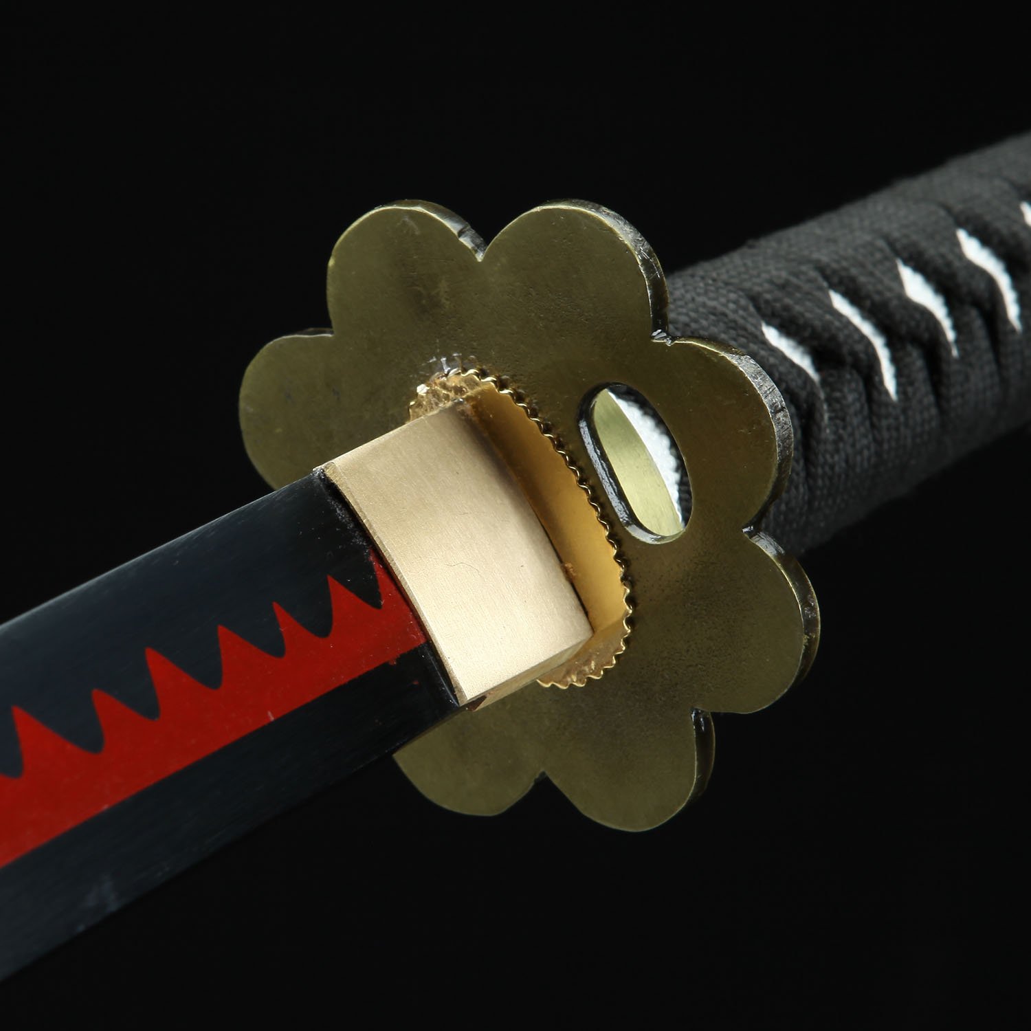 The Shusui Katana comes with a black hardwood saya (scabbard) that is coated with premium natural lacquer, providing a sleek and glossy finish. The saya features a manga-themed design that pays tribute to the One Piece series and adds a unique touch to this exceptional sword.