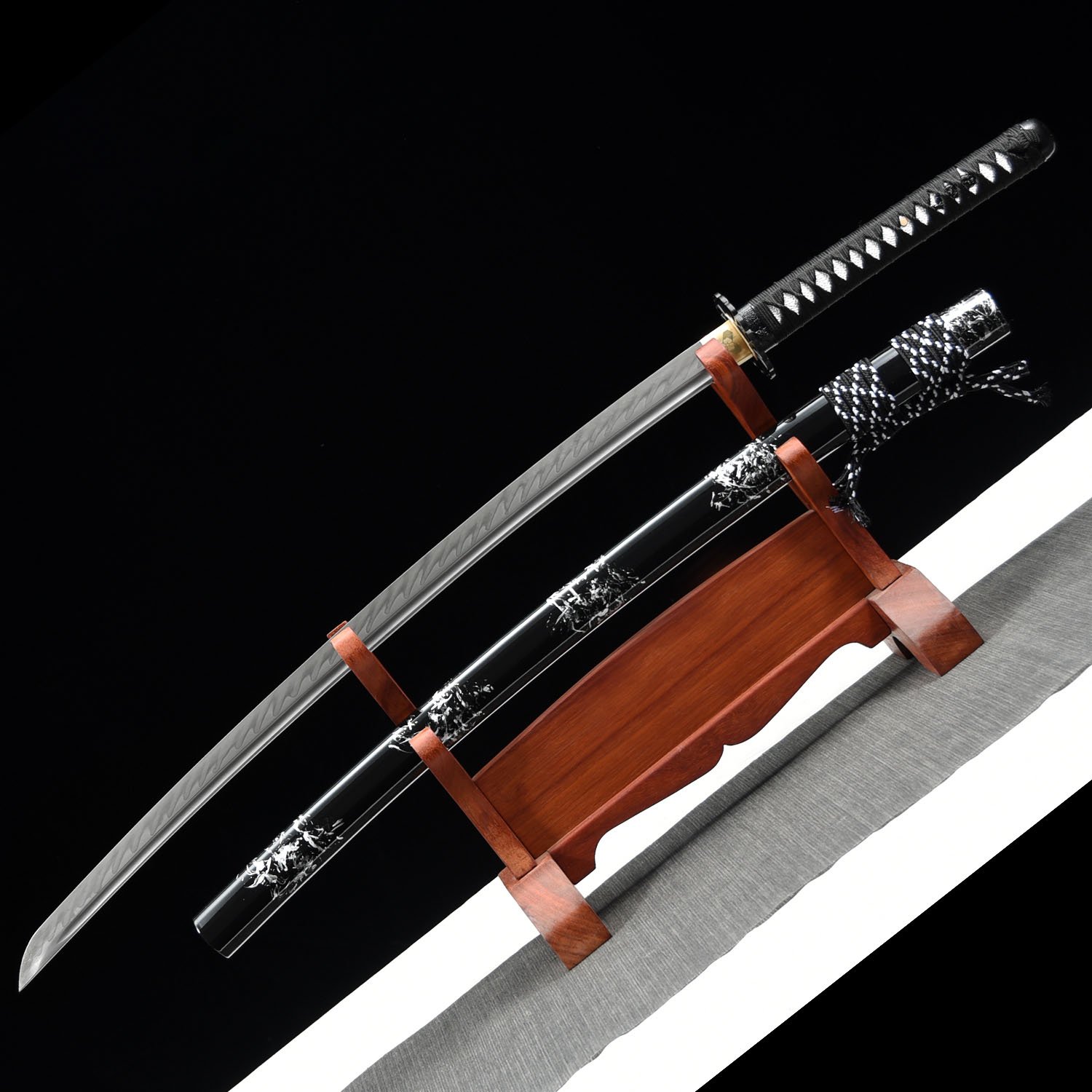 • Black katana, t10 carbon steel, clay tempered, real hamon, battle ready, handmade, full tang, blade polished, black cord handle, balck scabbard, alloy fittings