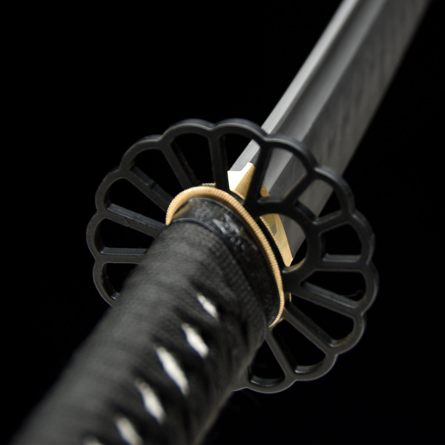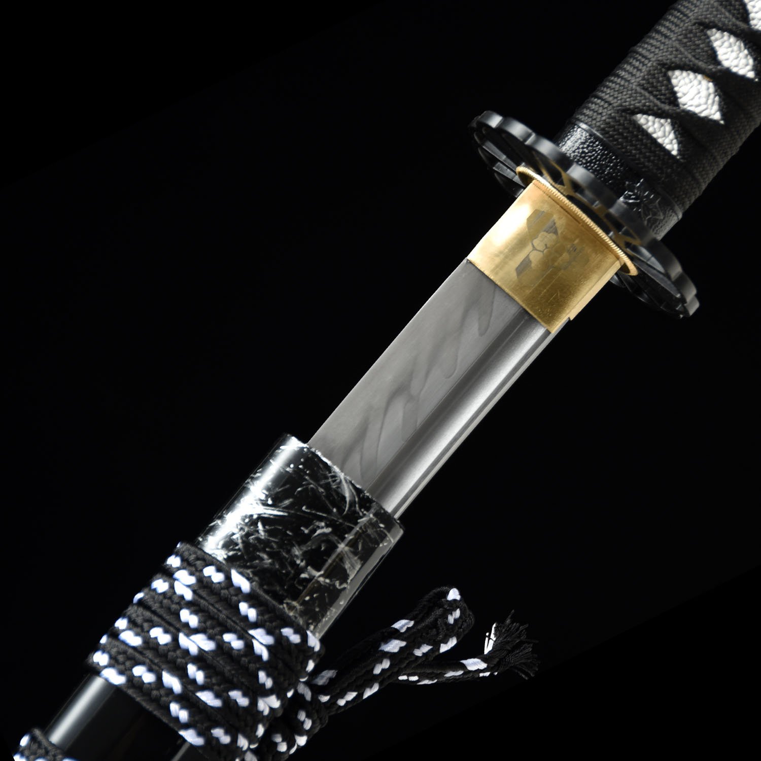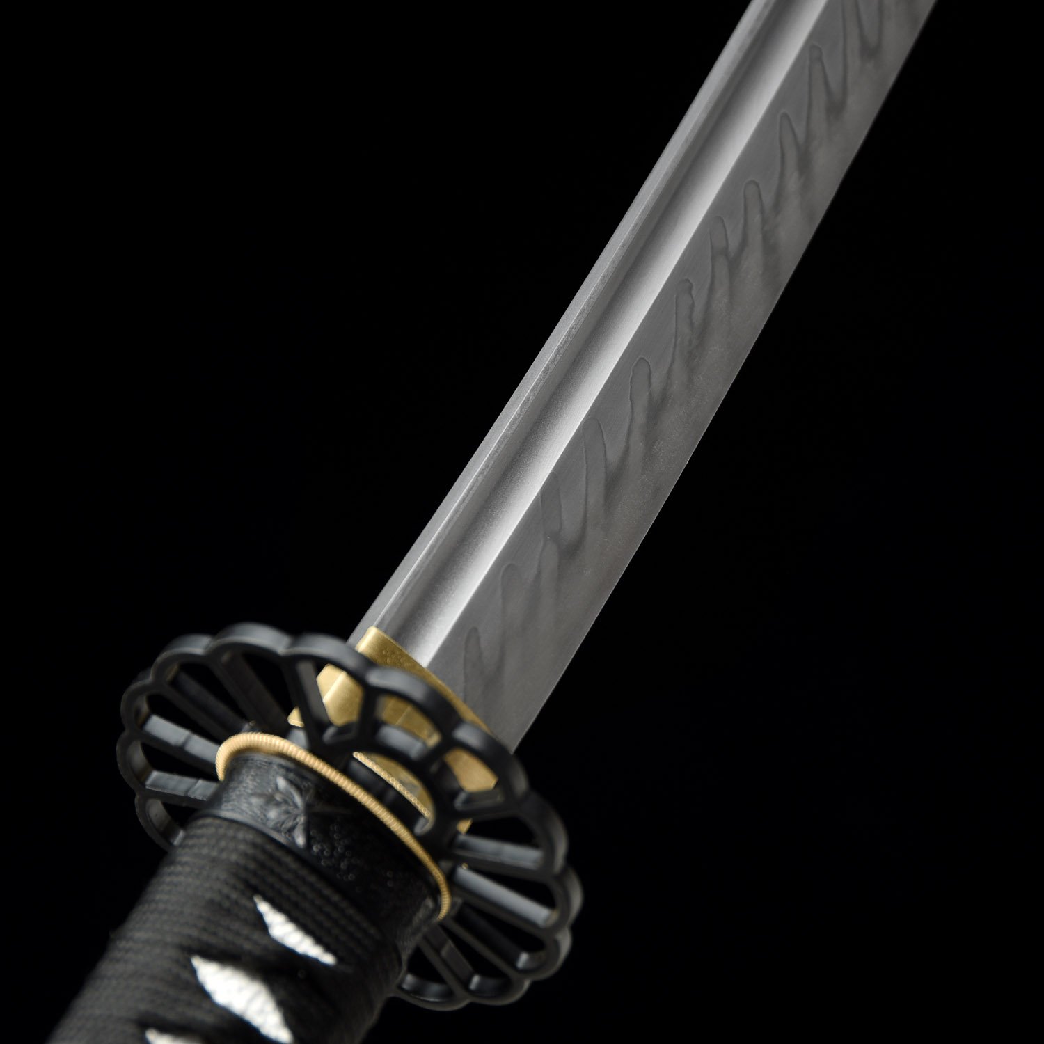 The blade has a long Hi (blood groove) on each side, this not only allows for a lighter blade and audible feedback when swung, but also can balance the blade to achieve optimal performance. The tip of the blade is a Chu Kissaki (medium length).This blade has been hand polished with multiple grade sharpen stone by Japanese method, which made the surface of the blade like a mirror, the blade is also very sharp.This blade comes with a full length Tang which greatly enhances the strength of the sword. this sword is strong enough to cut through a thick bamboo tree with a single strike yet sharp enough to slice paper.