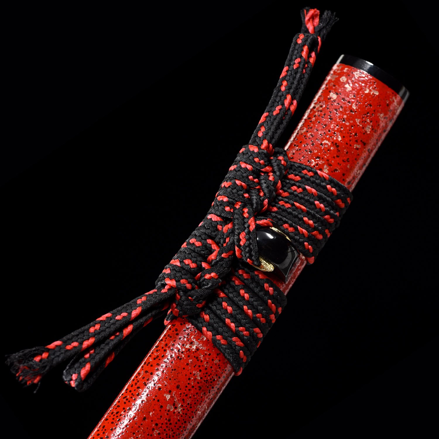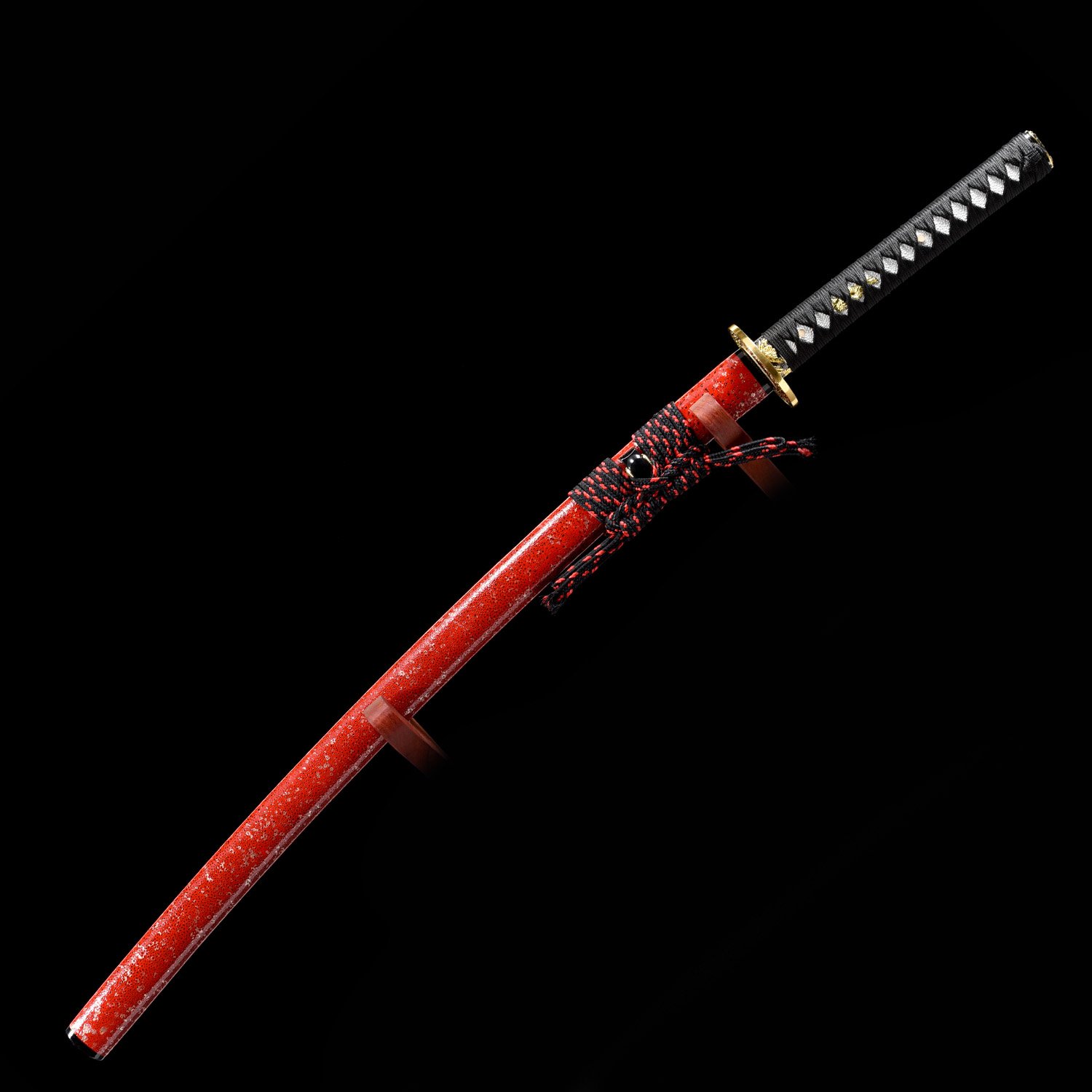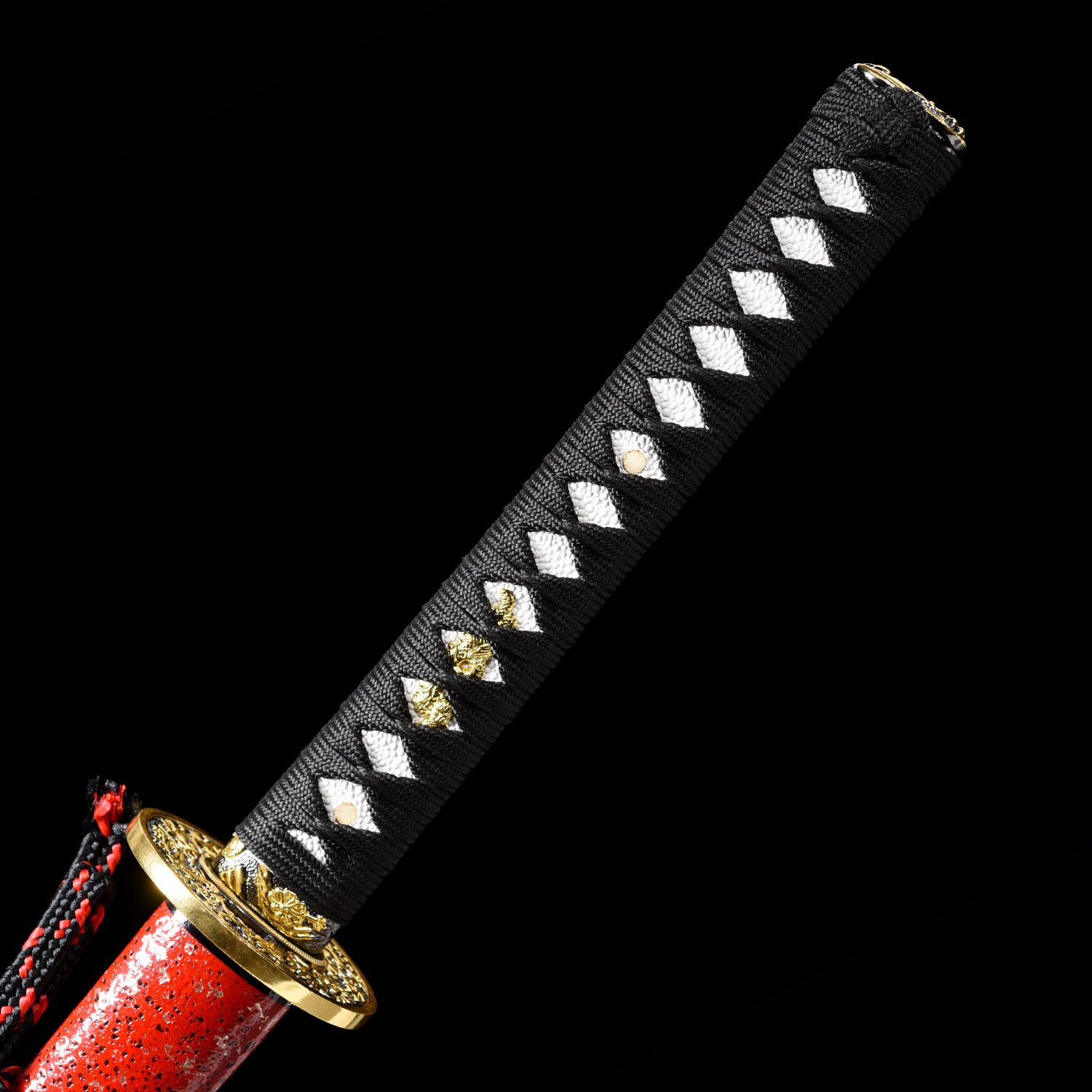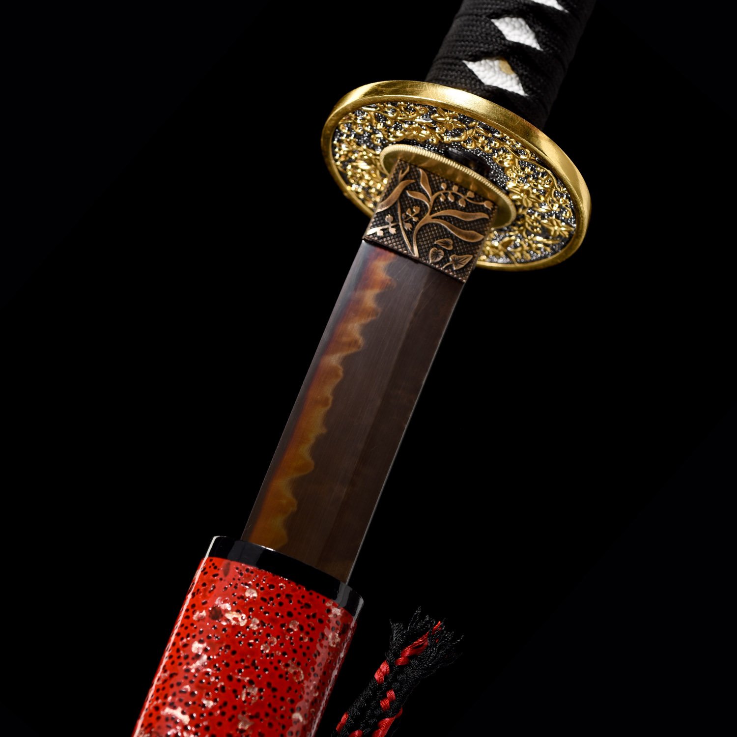 - Red katana, t10 carbon steel, clay tempered with real hamon, ready for battle, handmade, full tang, blade polished, black cord handle, red scabbard, Brass fittings