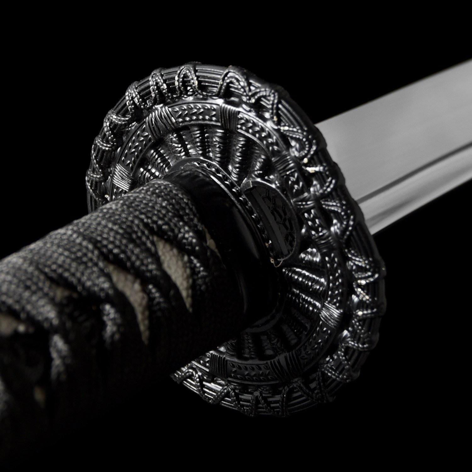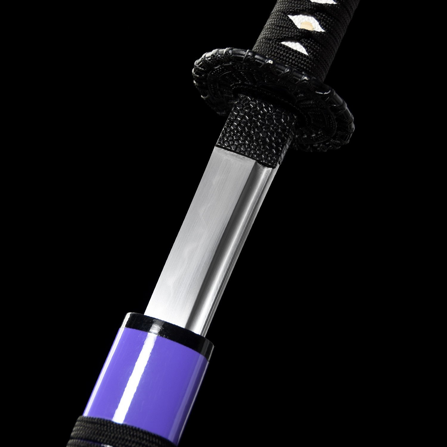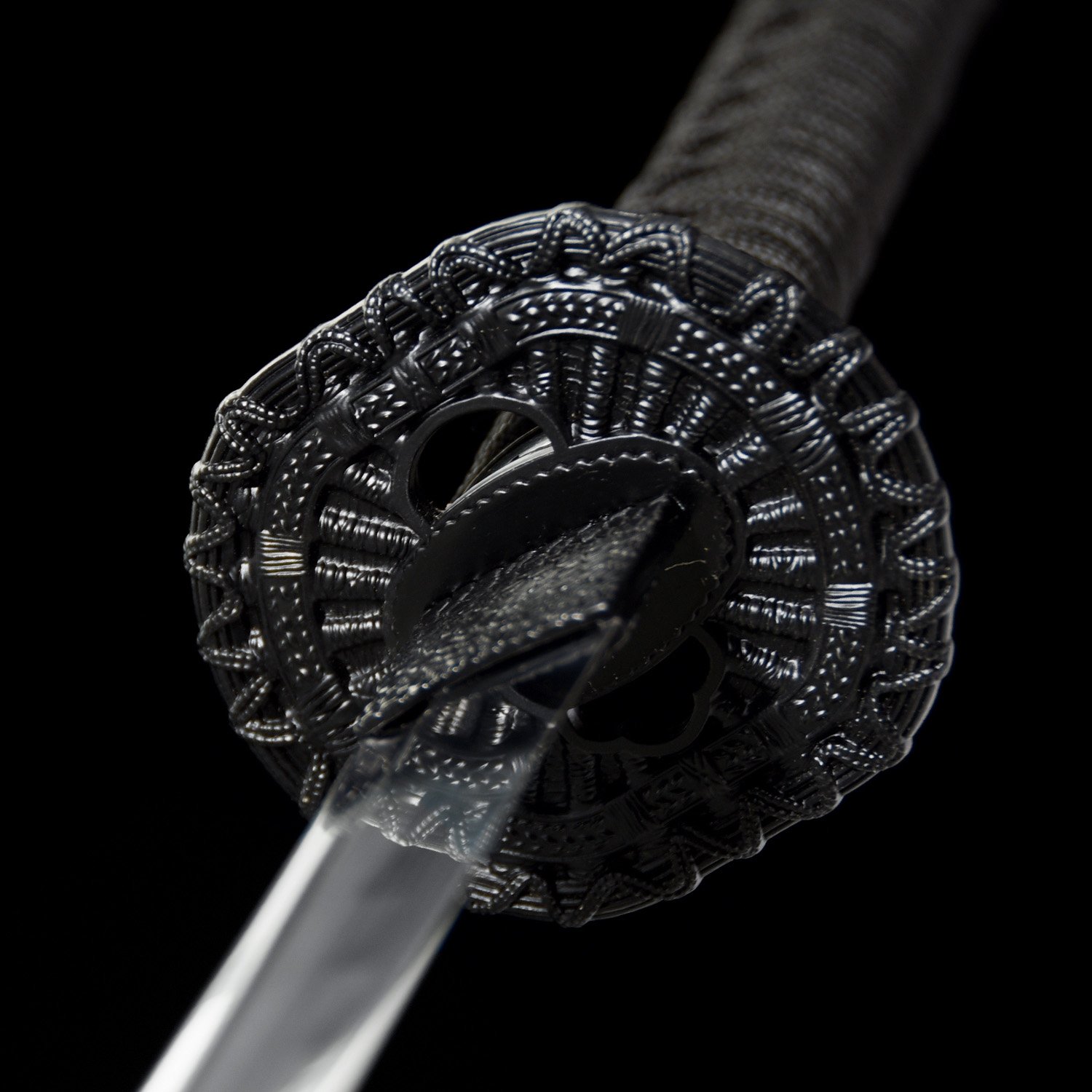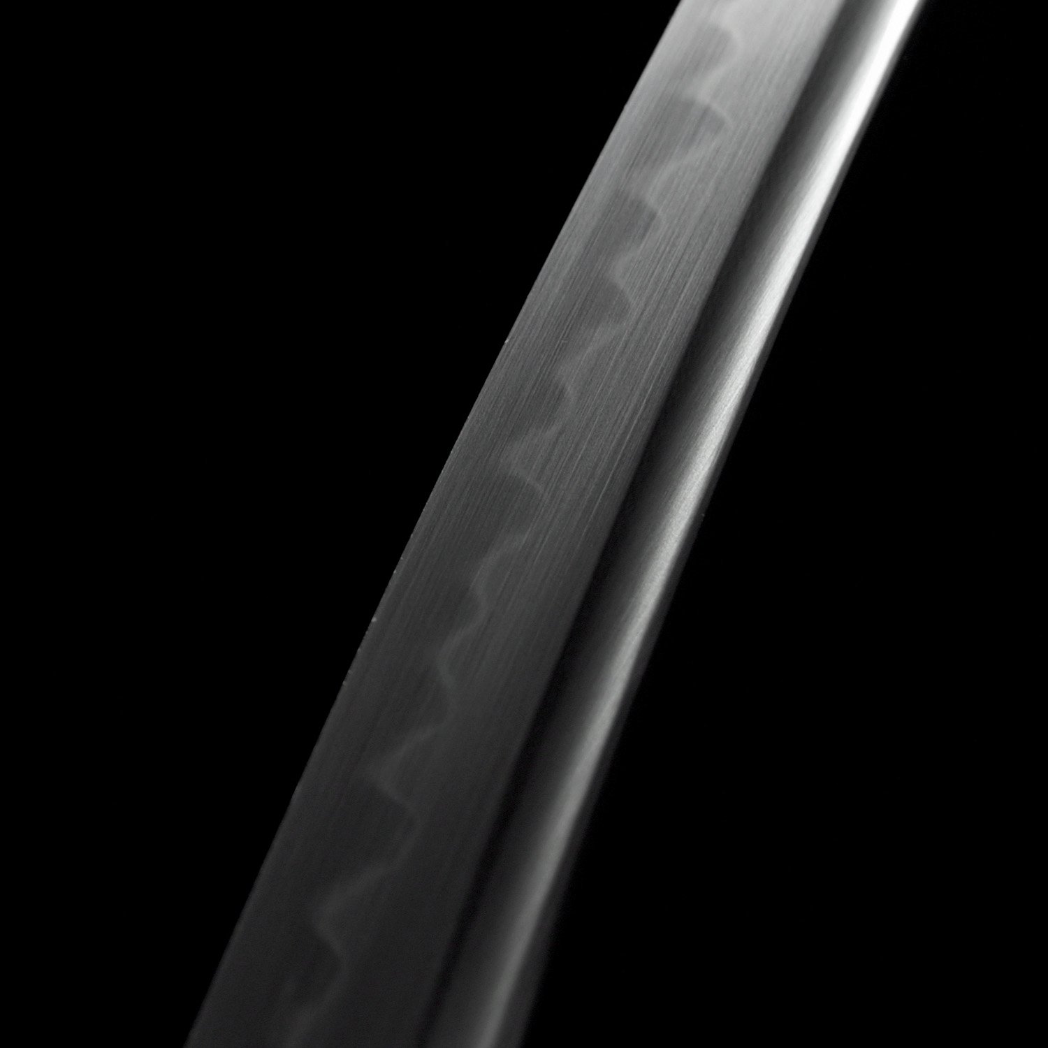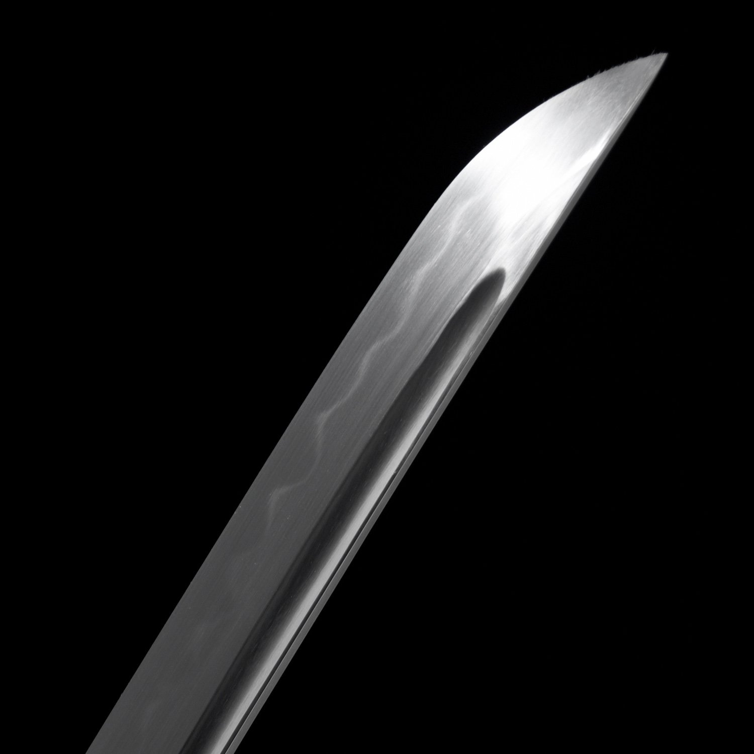 The blade has a long Hi (blood groove) on each side, this not only allows for a lighter blade and audible feedback when swung, but also can balance the blade to achieve optimal performance. The tip of the blade is a Chu Kissaki (medium length).This blade has been hand polished with multiple grade sharpen stone by Japanese method, which made the surface of the blade like a mirror, the blade is also very sharp.This blade comes with a full length Tang which greatly enhances the strength of the sword. this sword is strong enough to cut through a thick bamboo tree with a single strike yet sharp enough to slice paper.